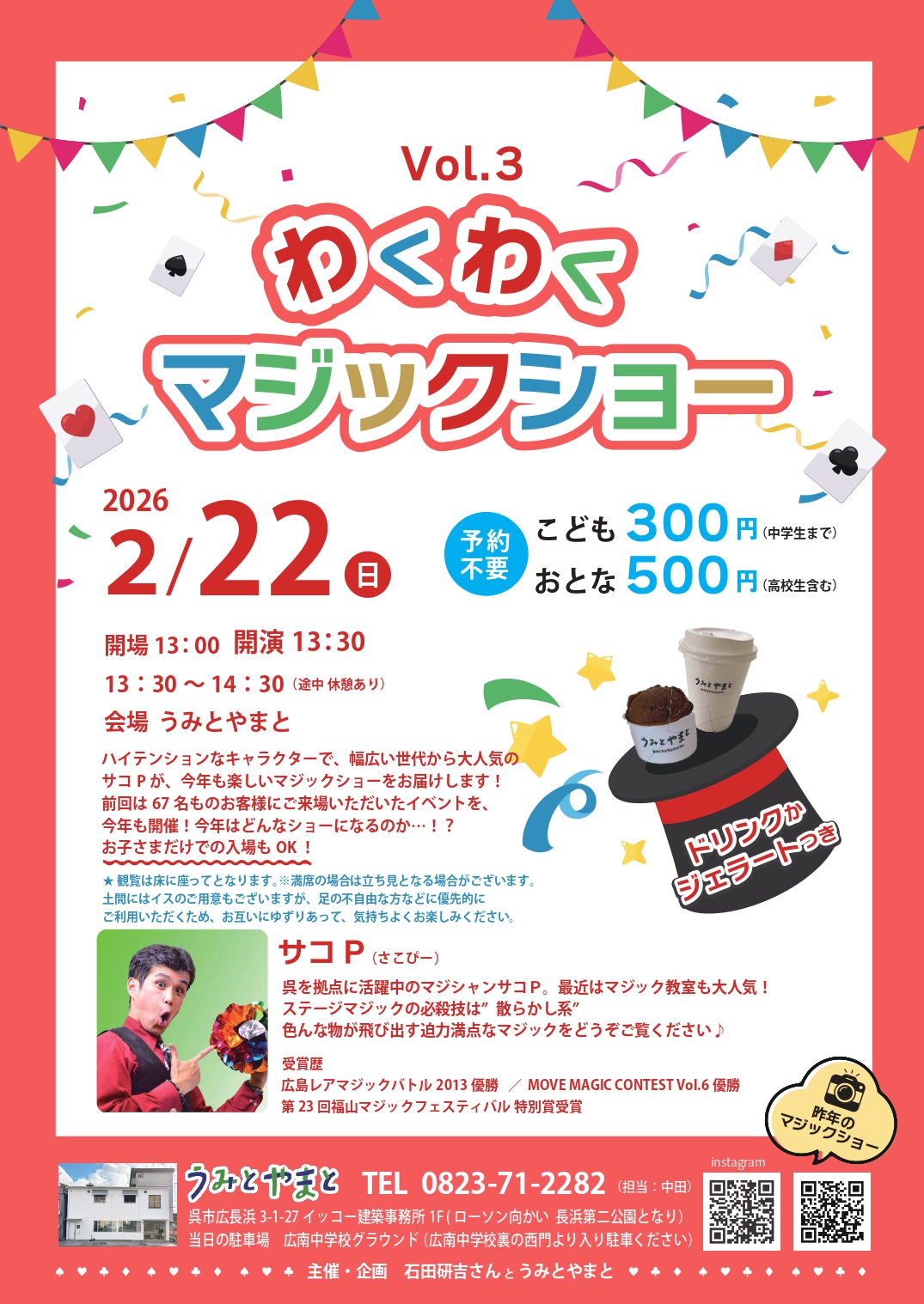 ・参加費:こども300円(中学生まで)おとな500円(高校生含む)ドリンクかミニジェラートつき
