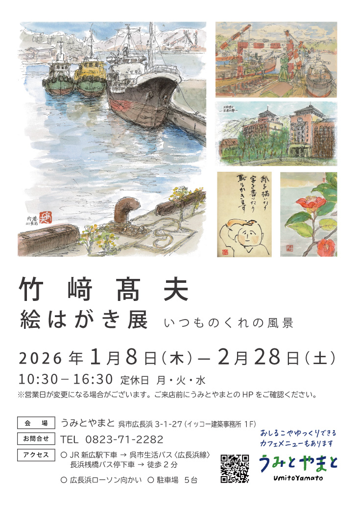 長年描きためてきた呉の風景を中心に、小さなスケッチや絵はがきを展示します。
